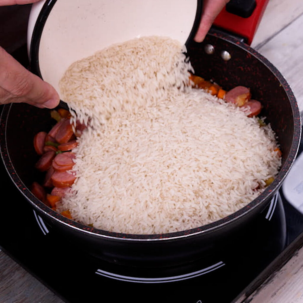 - Despeje a cenoura e a linguiça na panela e deixe fritar por aproximadamente 5 minutos.